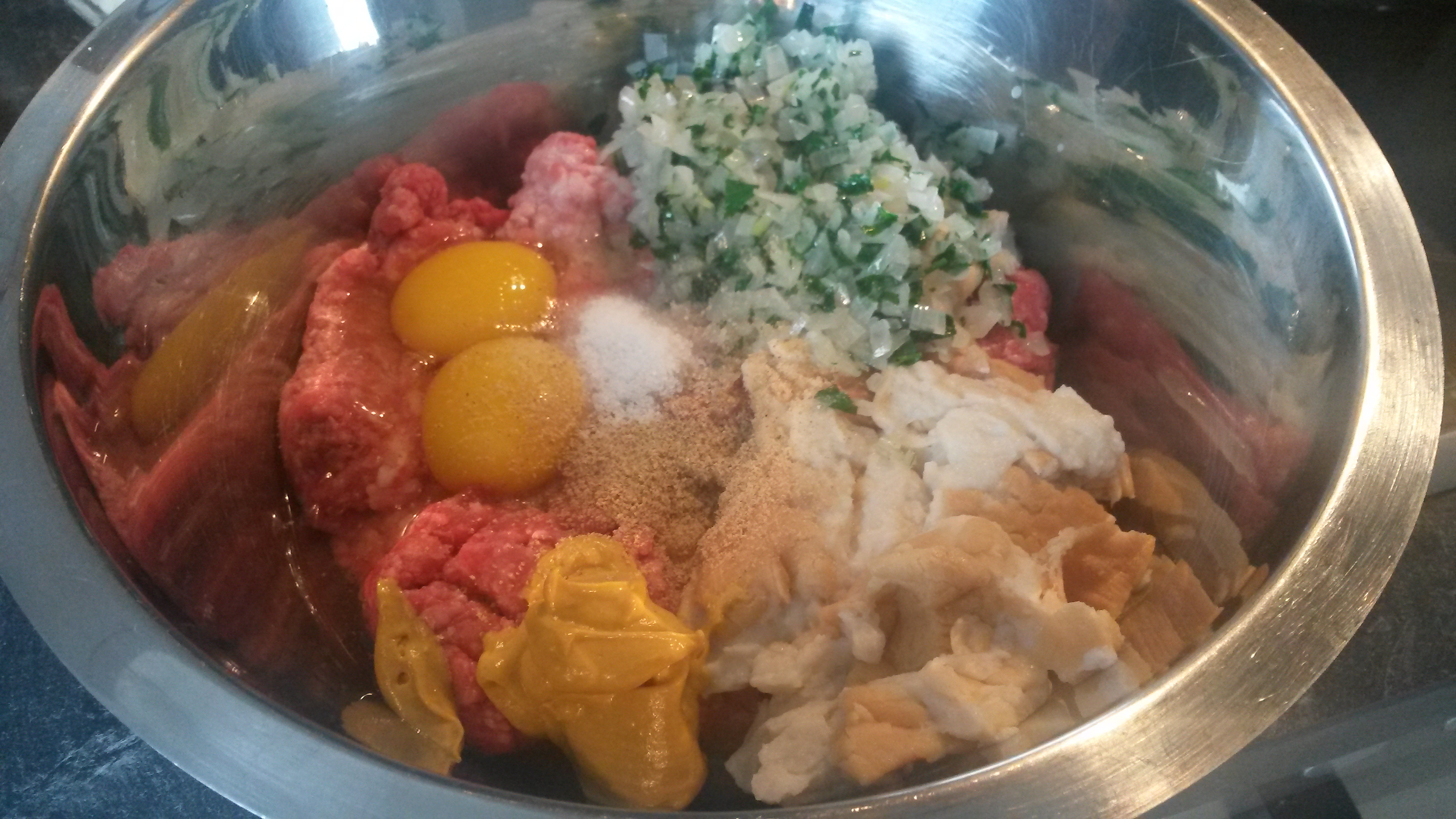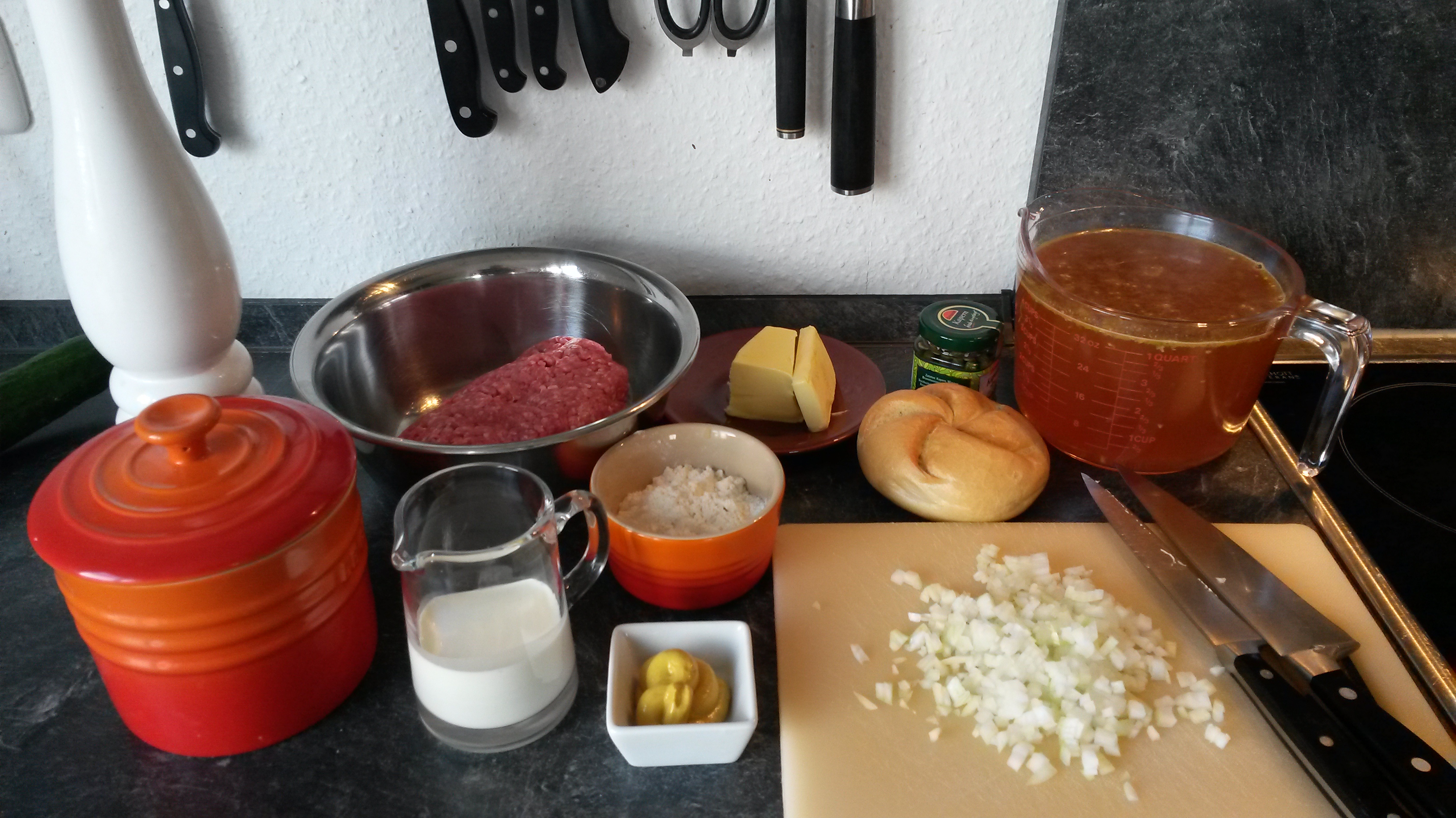 Inzwischen Rinderhack, Senf, Ei, Semmelbrösel kräftig mit Salz und Pfeffer würzen, verkneten und kleine Bällchen formen.