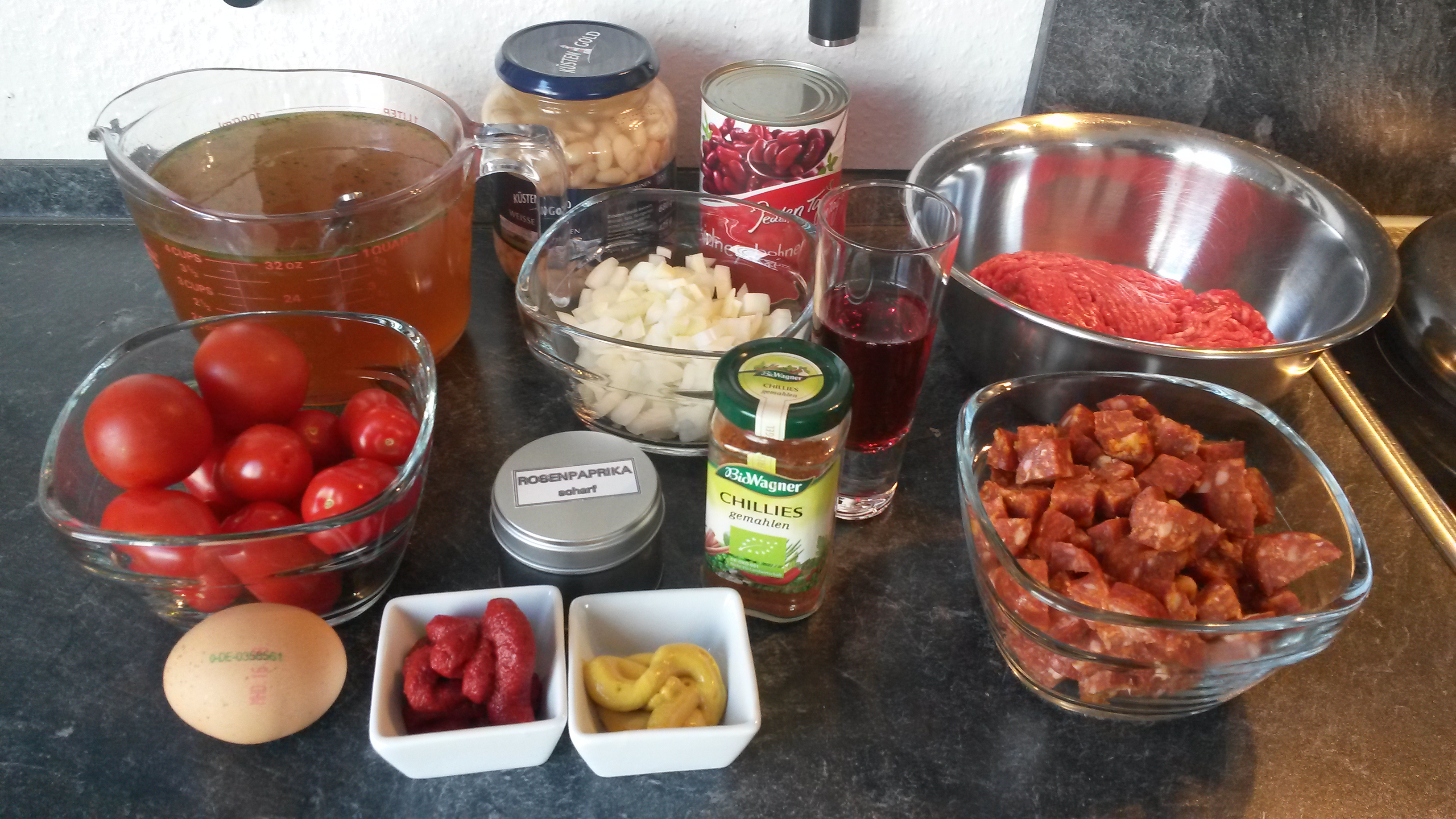 Bohnen in ein Sieb geben und kurz abspülen. Alle Zutaten in einem großen Topf vermischen, 30 Minuten leicht köcheln lassen und ggf. abschmecken (ich prognostiziere, dass nicht nachgewürzt werden muss).