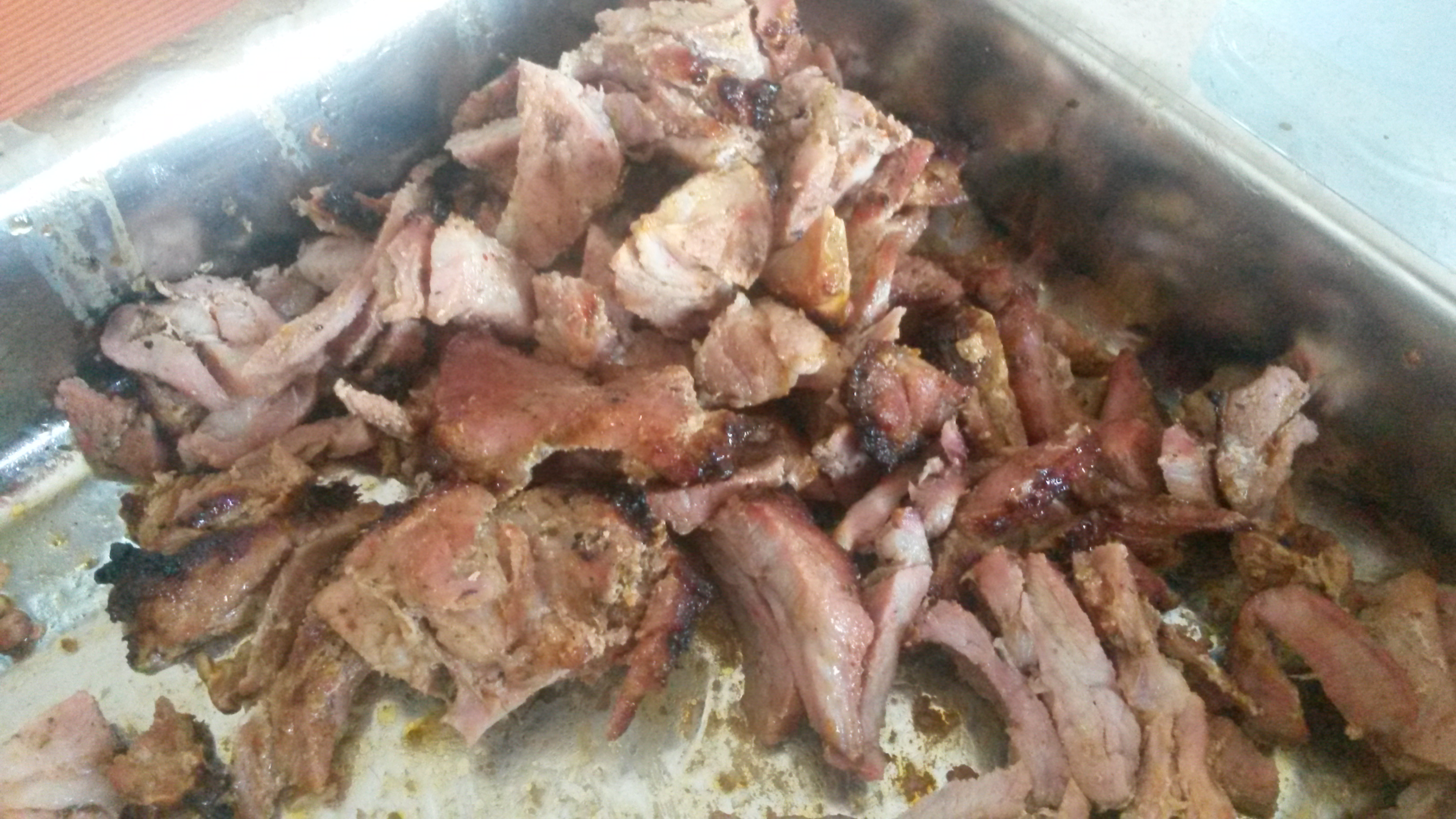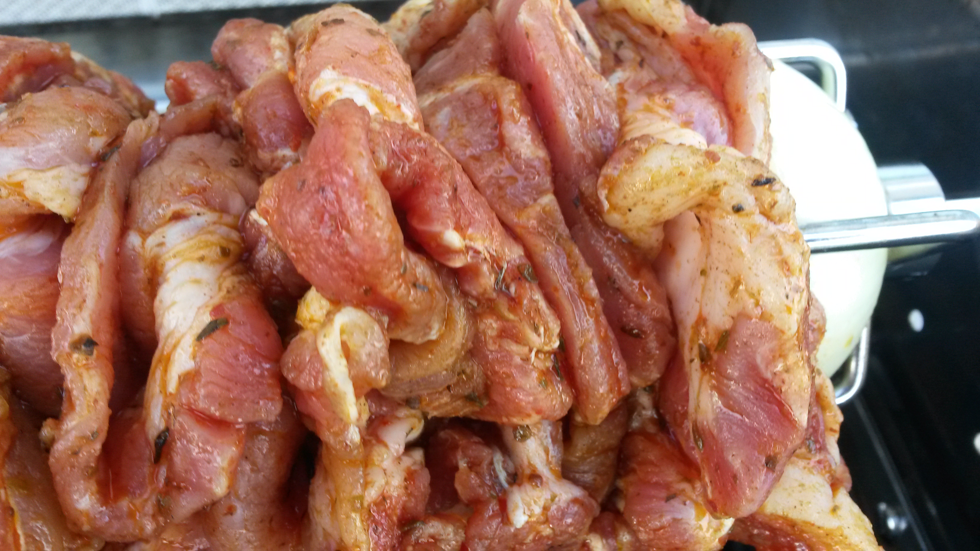 Nacken in nicht zu dünne Scheiben schneiden. Öl und Gewürz mischen und das Fleisch darin ‚baden‘. Es empfiehlt sich dafür Handschuhe zu tragen, da die Hände sonst ziemlich stark duften… Über Nacht marinieren lassen.