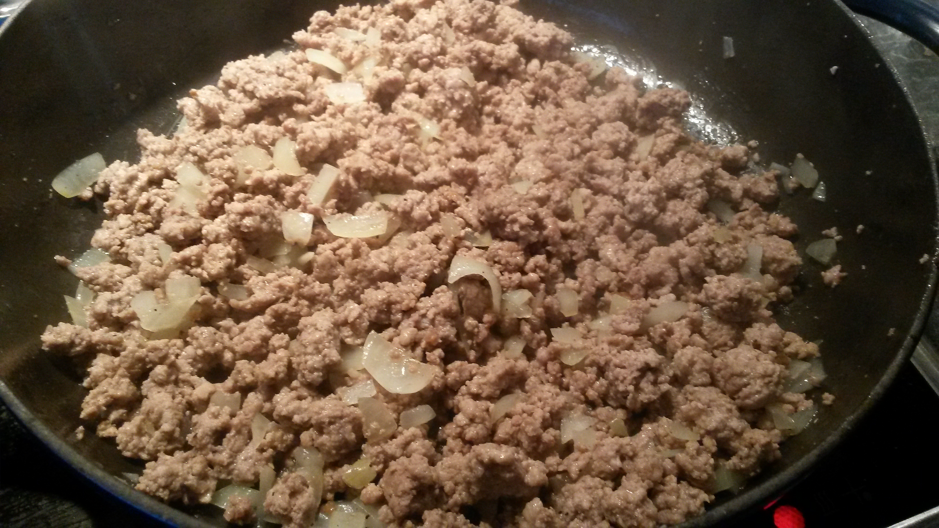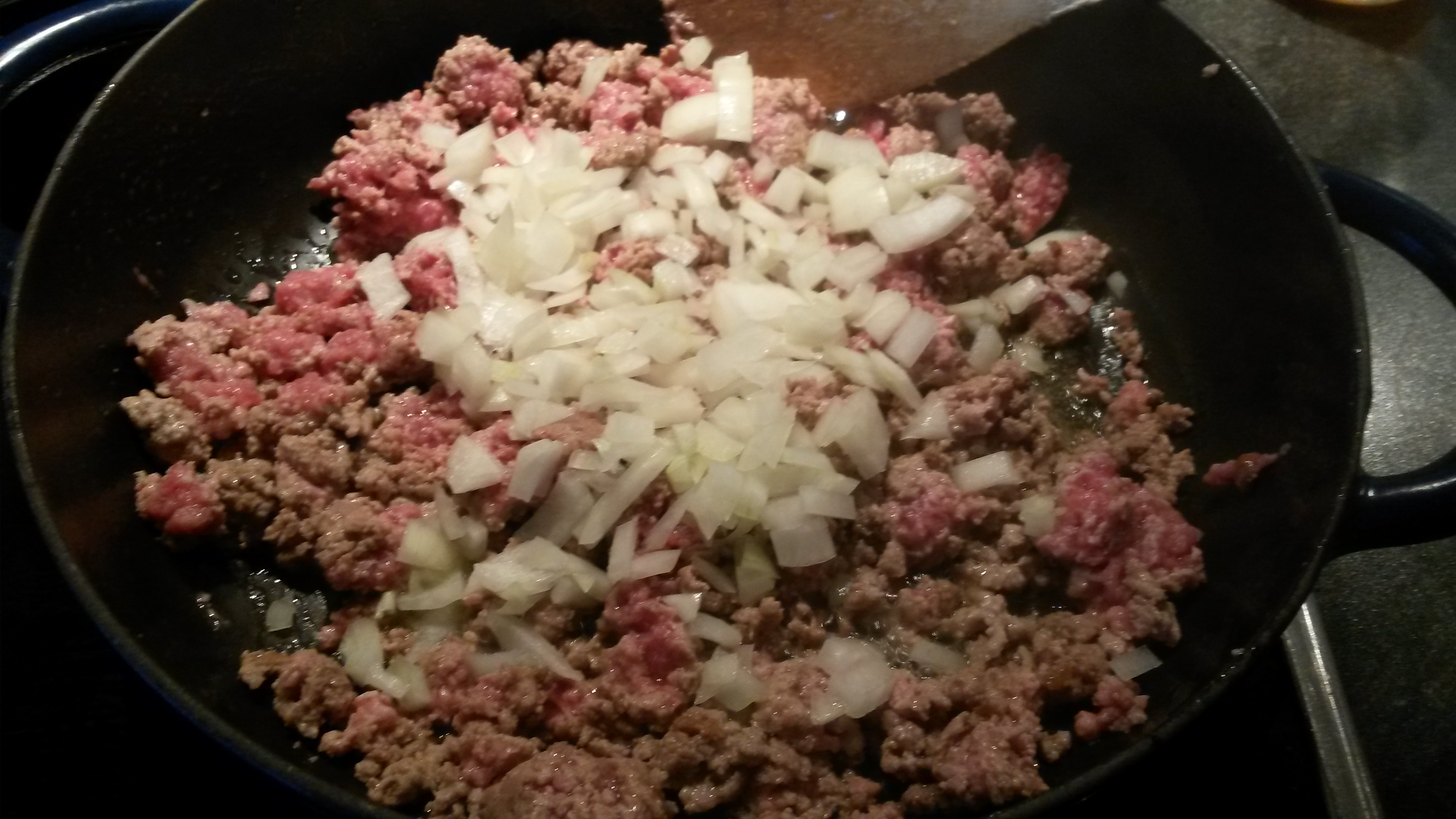 Hack und in Streifen geschnittene Zwiebel im heißen Öl anbraten.
