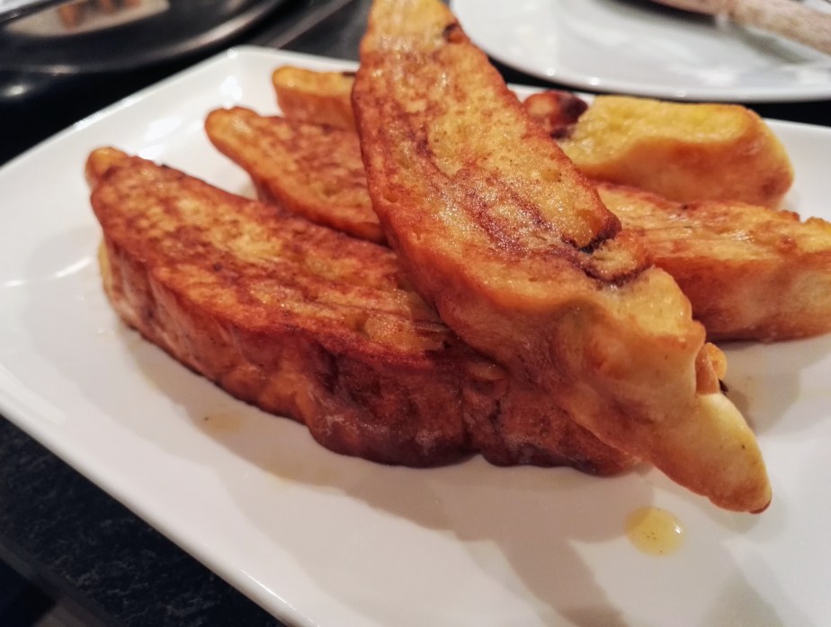Kartoffel-Baumkuchen in der Form abkühlen lassen, auf ein Brett stürzen und in Streifen schneiden. Restliche Butter und Öl in einer beschichteten Pfanne erhitzen. Kartoffel-Baumkuchen darin bei mittlerer Hitze 2-3 Minuten auf beiden Seiten braten.