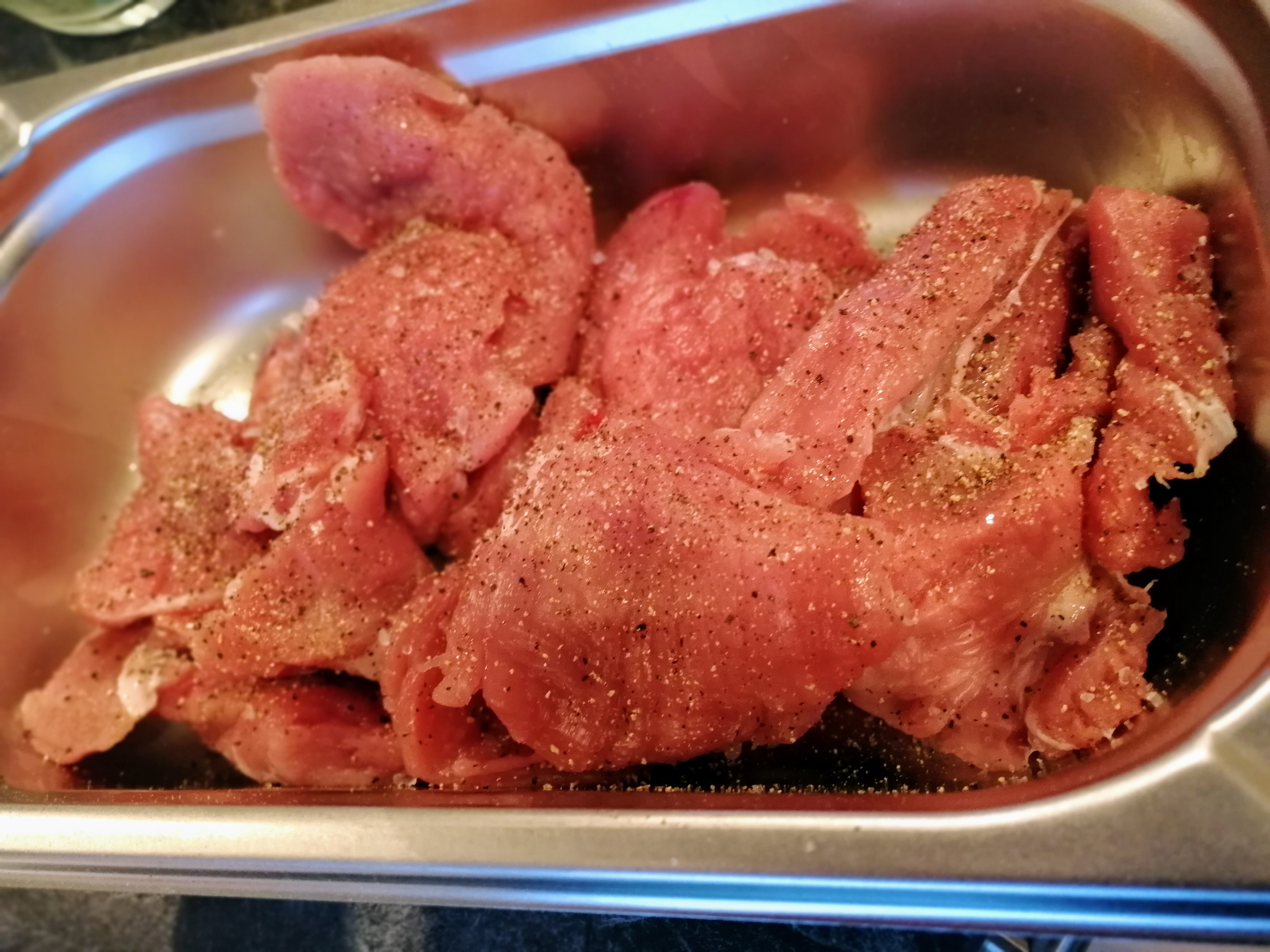 Das Filet in daumendicke Scheiben schneider und mit dem Flischhammer etwas plattieren, mit Salz und Pffer würzen.