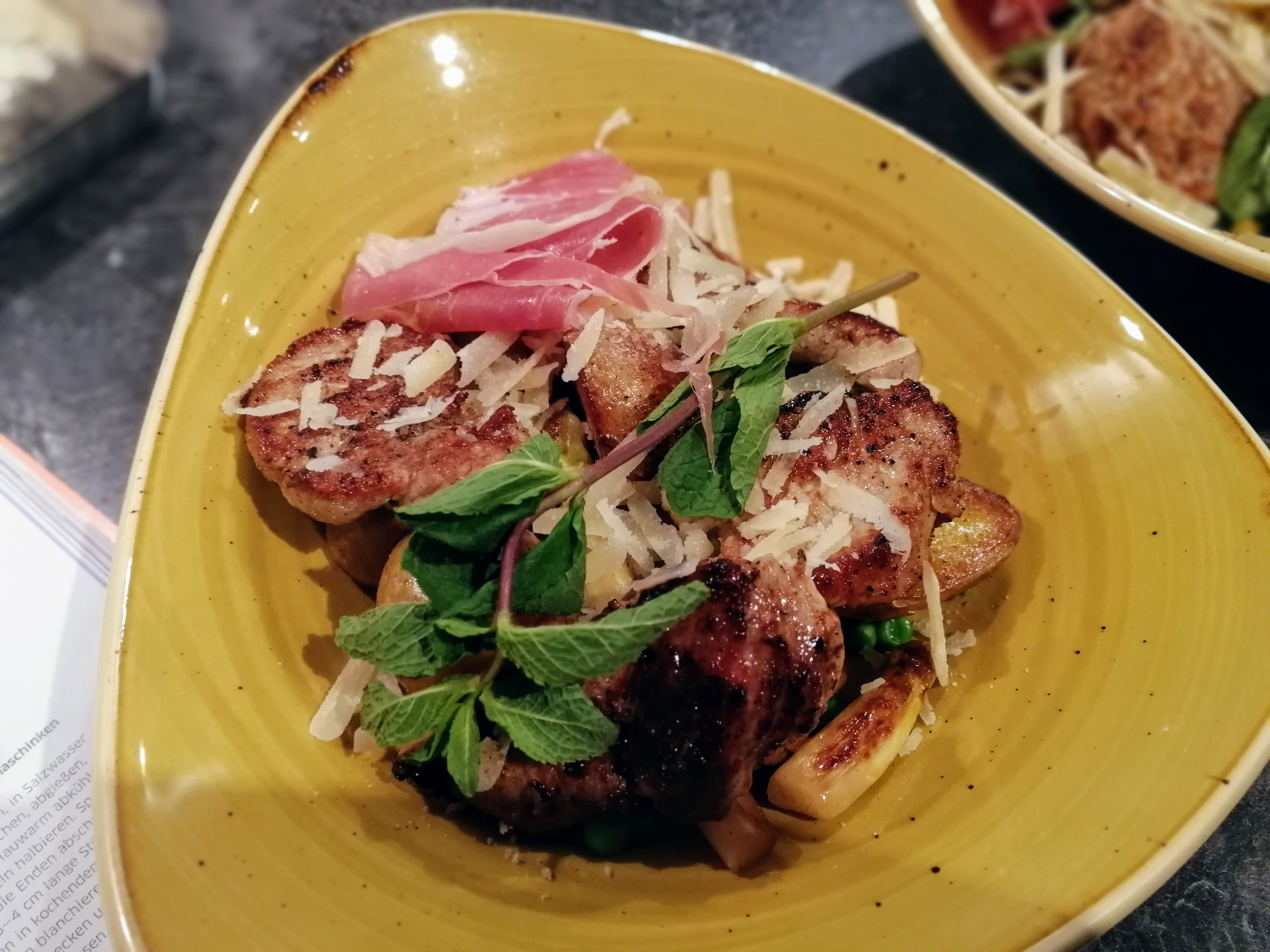 Pfanne mit einem Küchentuch auswischen, Rest Öl und Butterschmalz erhitzen und das Fleisch in zwei Portionen kurz, aber kräftig anbraten. Vorgewärmte Teller mit Kartoffel-Spargelmischung und Fleisch anrichten. Mit Minze, Zitronenabrieb sowie Käse anrichten.